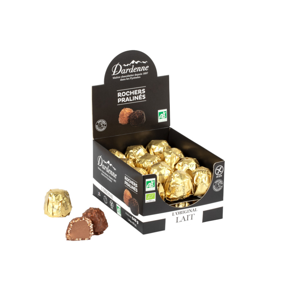 Découvrez le Rocher praliné au chocolat au Lait, l'ORIGINAL de Dardenne dans un présentoir. Chaque rocher est emballé dans un joli papier doré. 24 bouchées de 27g à offrir ou à s'offrir pour un grand moment de gourmandise! Vous apprécierez la parfaite association du croquant de la noisette et du pralin fondant fait-maison, délicatement enrobés d'un chocolat au Lait gourmand. Chocolat bio et issu du commerce équitable.