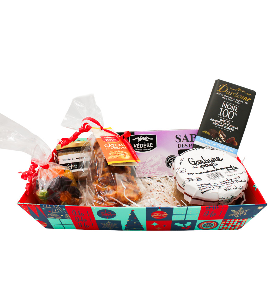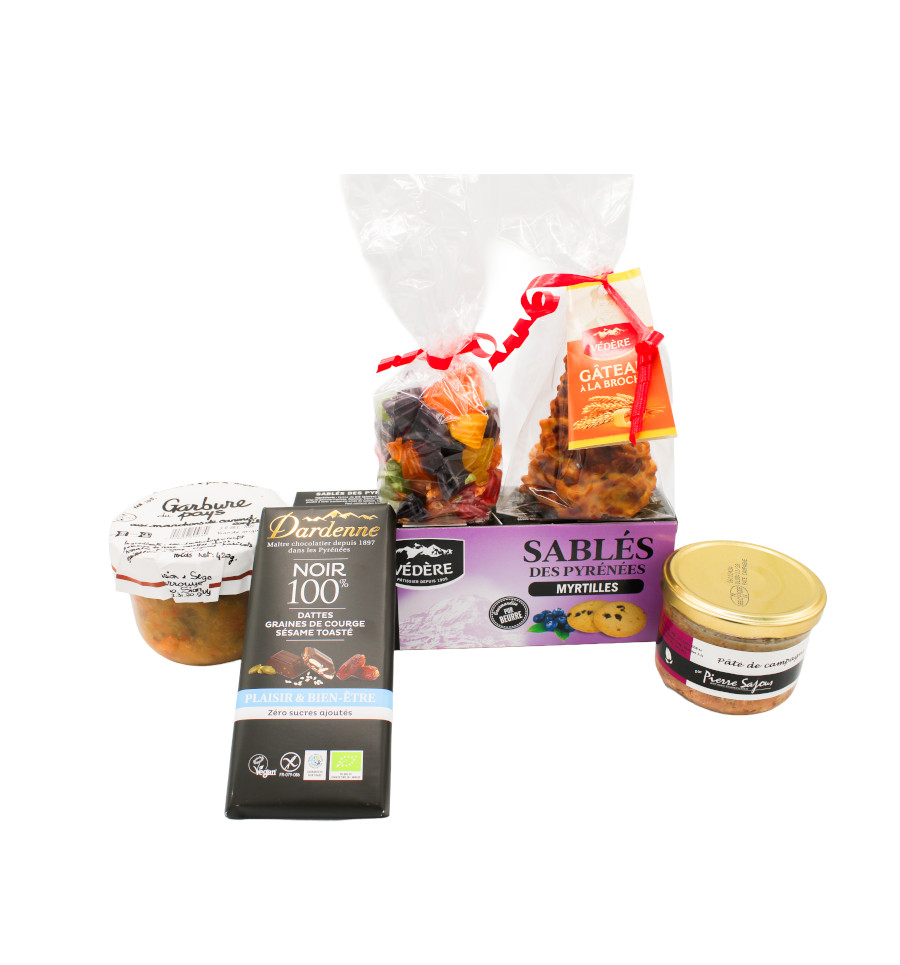 Un grand coffret gourmand, garni de 6 spécialités pyrénéennes. Vous trouverez dans ce coffret : un pâté de campagne de la conserverie Pierre Sajous 180g , un gâteau à la broche 100g de la maison Védère, un sachet de berlingots 200g, Une Garbure du Pays 420g de la conserverie Larrouyet, 1 tablette de chocolat 100% Noir Dattes, Graines de Courge et Sésame Toasté de la chocolaterie Dardenne et les délicieux sablés des Pyrénées à la myrtille 170g de la biscuiterie Védère. Le cadeaux idéal pour les gourmands !