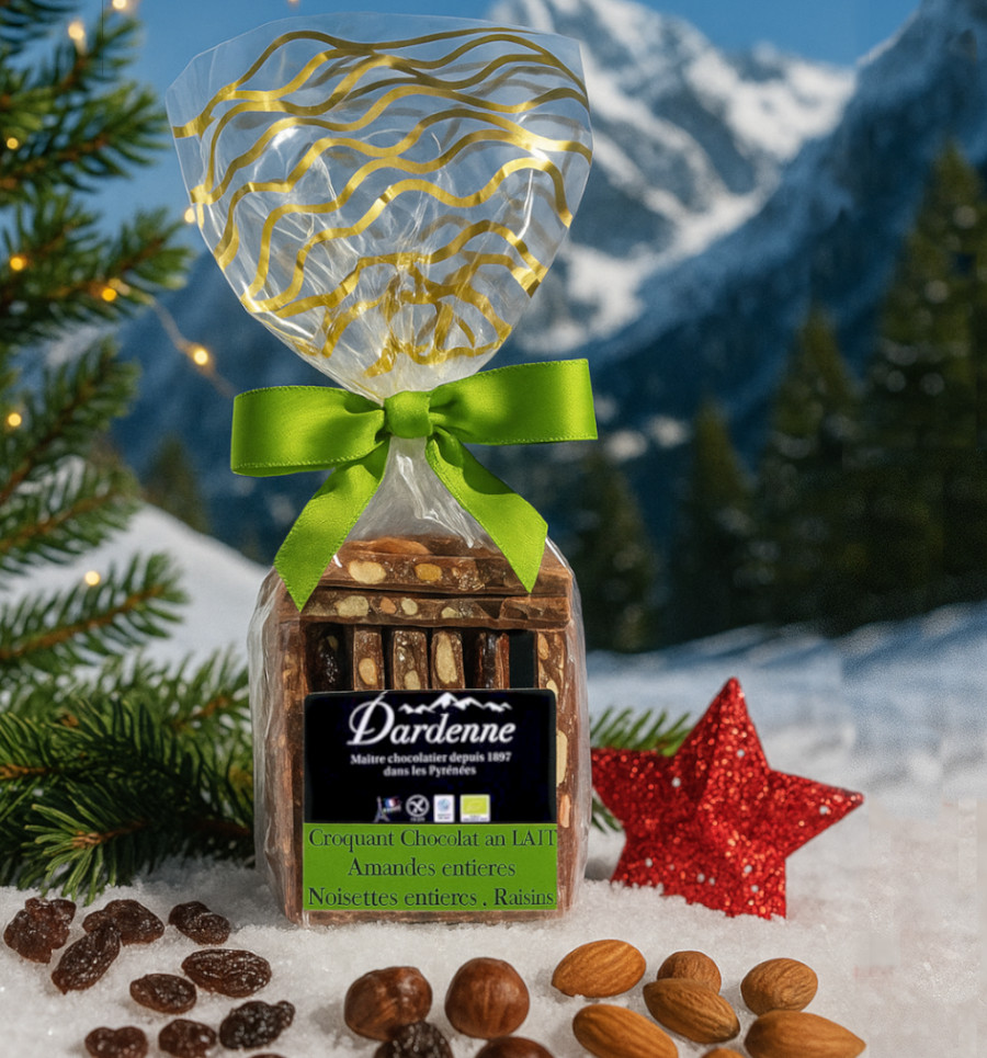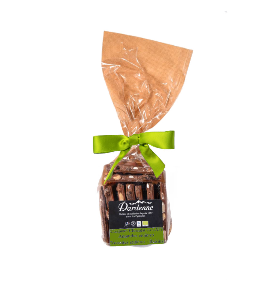 Beurre de cacao*², sucre de canne blond*², LAIT entier* (22%), AMANDE*(12%), raisin* (12%), NOISETTE* (12%), masse de cacao*², LAIT écrémé* (3.6%), vanille en poudre*