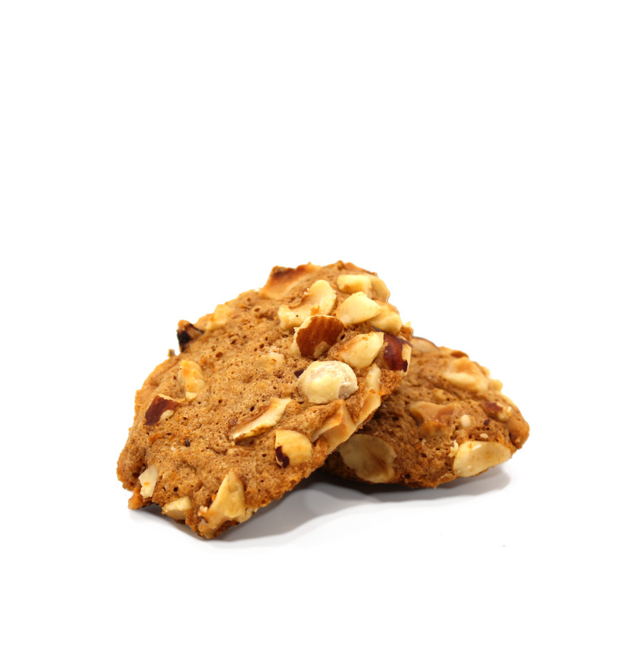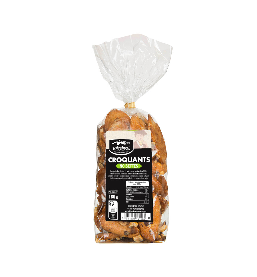 Farine de BLE, sucre, NOISETTES 15%, ŒUFS, dextrose, poudre de LAIT écrémé, sel, poudre à lever : carbonates d’ammonium, arôme naturel.