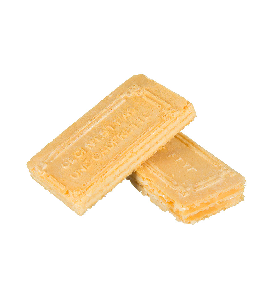 Sucre, farine de BLE, matière grasse végétale non hydrogénée (palme), arômes, colorants : bêta-carotène et caramel ordinaire, sel, émulsifiant : lécithine de SOJA, poudre à lever : carbonate de magnésium.