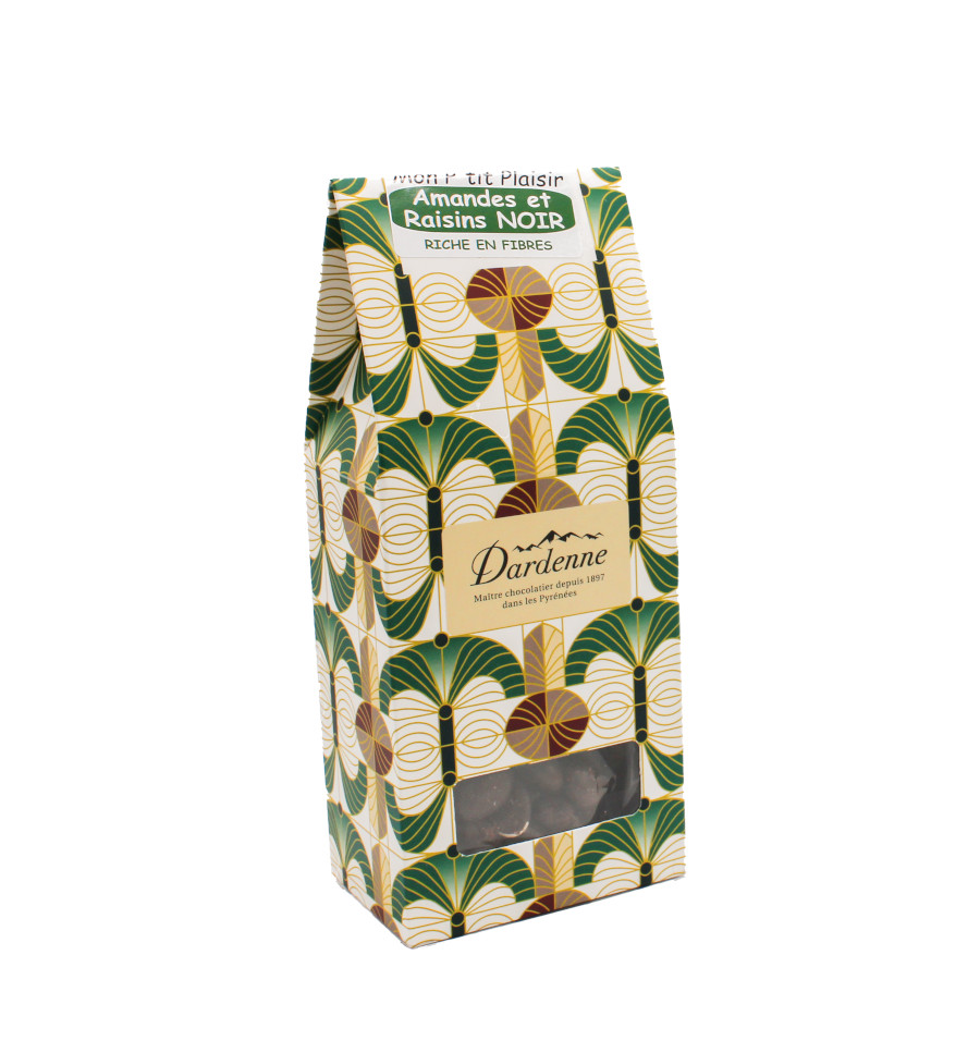 60% amandes enrobées chocolat noir et 40% raisins enrobés chocolat noir. Ces proportions sont garanties à la mise en oeuvre et peuvent varier d’un sachet à l’autre.