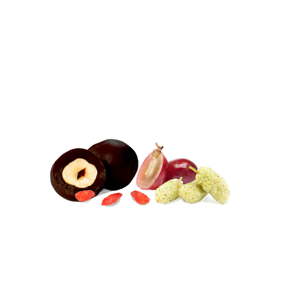 La douceur et l’onctuosité des mures blanches et raisins secs est alliée aux saveurs acidulées des baies de goji. Les noisettes entières enrobées de chocolat Noir 71% de cacao apportent croquant et gourmandise à ce mélange.