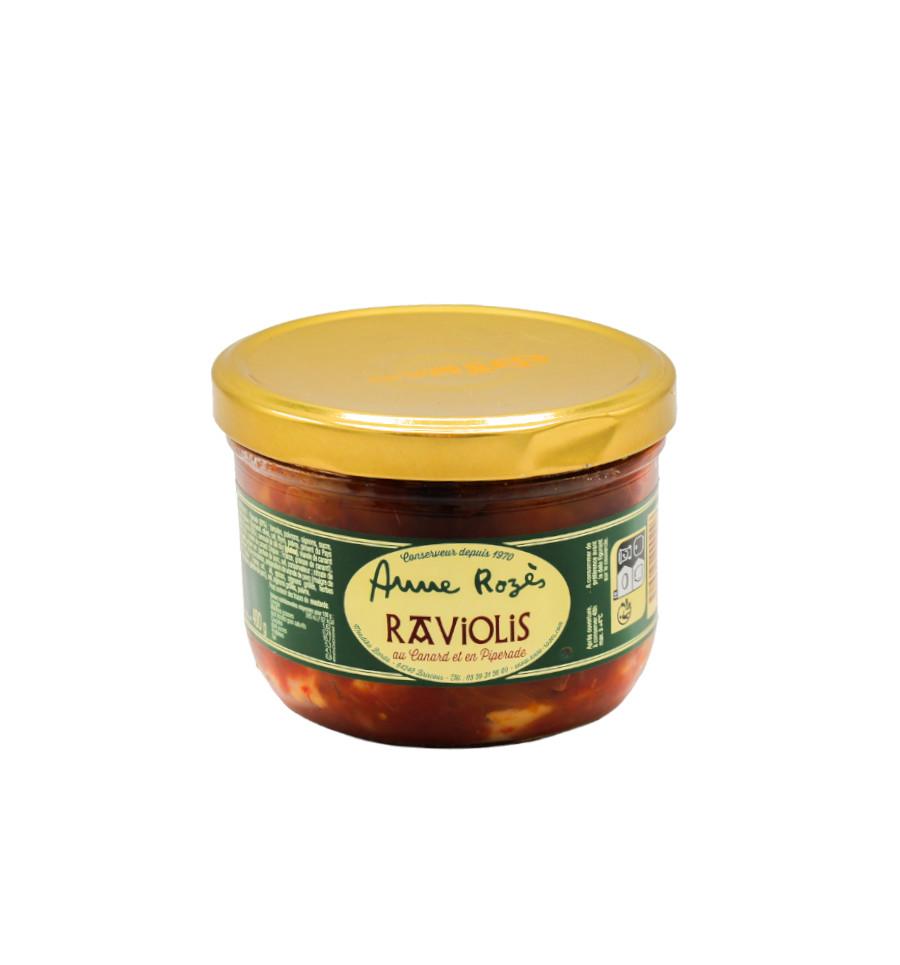 Raviolis (20%) : semoule de BLÉ dur (gluten), viande de canard confit (18%) (viande de
