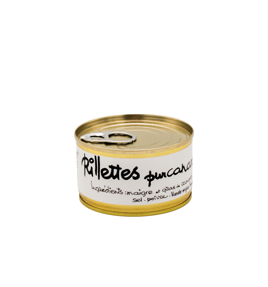 Viande et peau de canard rôti et cuit au four 65,23%, graisse d’oie 32,62%, sel blanc alimentaire non iodé, non fluoré ( marin, ignigène ou gemme) 1,61%, poivre noir en poudre 0,54%.