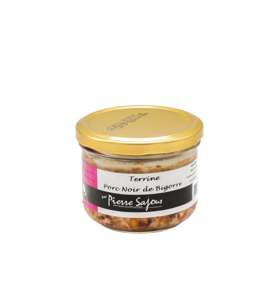 Maigre et gras de Porc Noir de Bigorre AOP (63%), foie de porc (27%) (origine : France),blanc d’ŒUF poudre, farine de riz, farine de chicorée, arôme naturel,